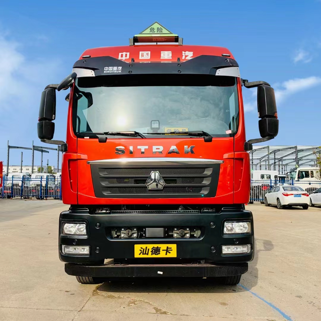 汕德卡國六前四后八危險品車采用的是汕德卡G5-U駕駛室(可選擇高頂雙臥駕駛室) ;MC07H.35-60發動機;HW13709XSTC2變速箱;VPD75D前軸(盤);MCY11BGS自調臂雙后橋(鼓);速比4.63;雙層車架(8+4/280);前少后空氣懸架(3/3/-/-);博世方向機;前置排氣系統;AEBS(EBS+ESC);高位保險杠(全金屬),295/80R22.5;400L油箱;LDWS+FCWS;中國重汽智能通B版;電磁式電源開關;轉向輪爆胎應急裝置;