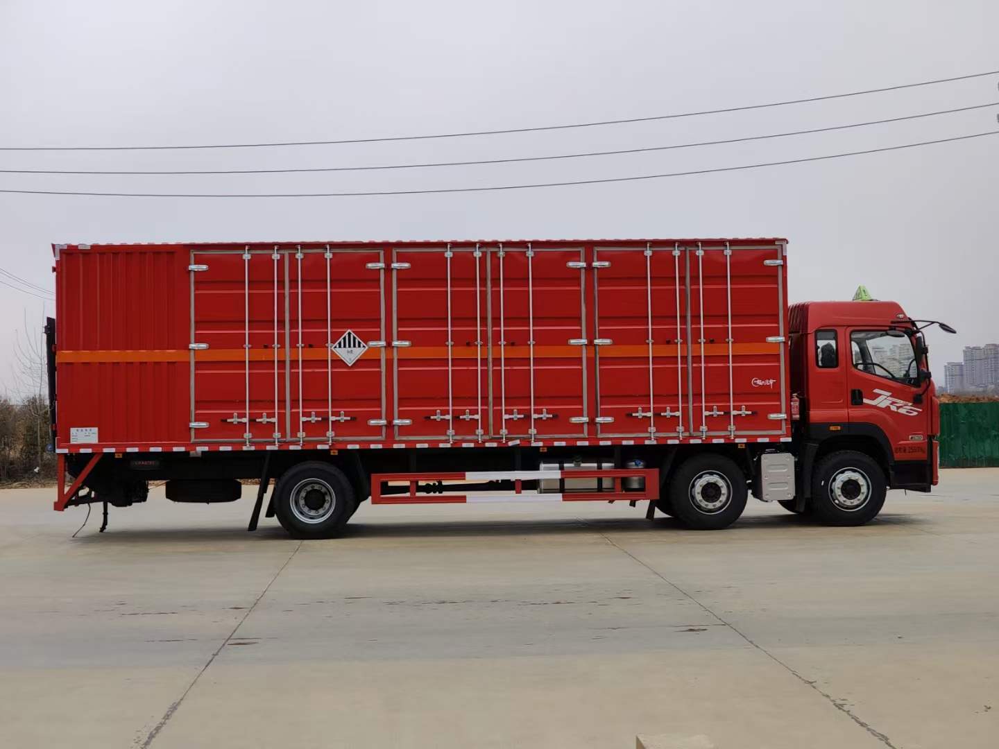 解放四軸國六帶左右開門危險品車箱體采用整體上裝靜電噴塑高溫烤漆工藝。錫柴260馬力,法斯特8擋,箱體尺寸9600*2450*2600mm。上裝箱體采用的是9.6米瓦楞車廂,廂體為單層瓦楞結構,邊板1.2底板4毫米,標配一個對開門,廂體底部可選裝5毫米帶2層子午線橡膠板,車輛副梁配備導靜電帶,廂體內襯壁可選裝固定貨物的臥環,卡槽、槽鋼、鋼筋、方管,廂體內頂部安裝煙感報警器,廂體安裝防盜報警器。箱體采用整體上裝靜電噴塑高溫烤漆工藝。部分公告樣車為普通油漆。