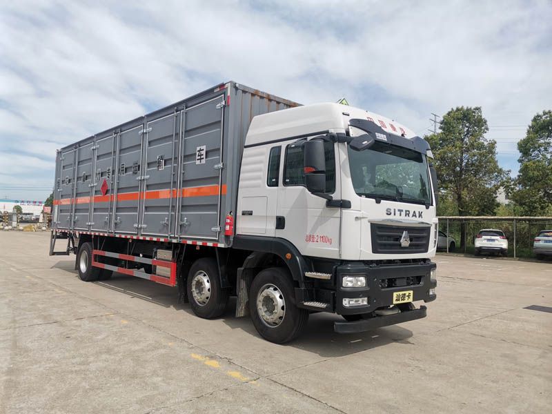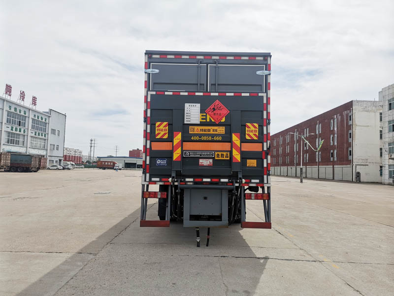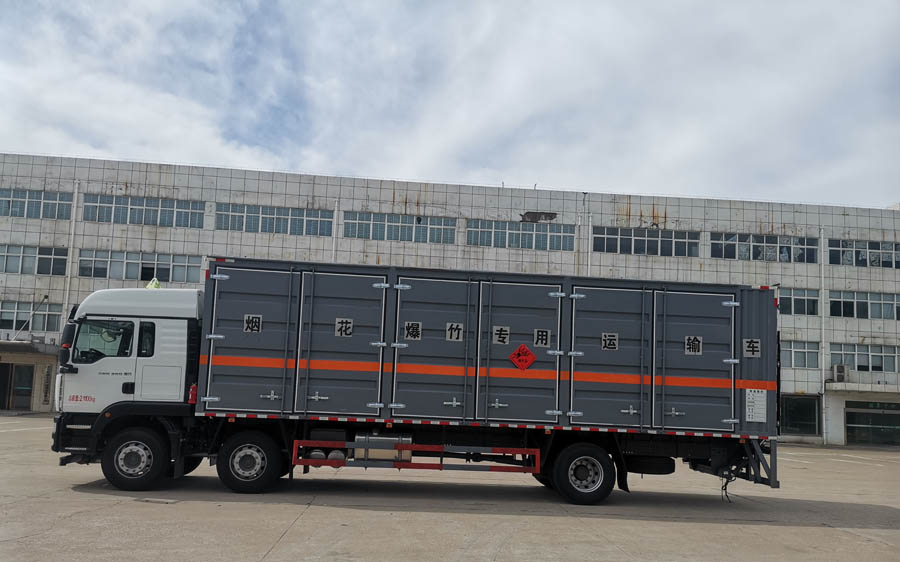 重汽豪沃國六三軸煙花爆竹運輸車采用的是帶三開側門,箱體容積大,貨箱采用的是左右開門,裝貨方便,箱體采用的是14號槽鋼, 橫梁采用的是8號槽鋼,邊框10號槽鋼,廂體采用1.2毫米厚瓦楞板結構,車廂底板鋪5毫米厚花紋板,車廂底板鋪防靜電膠皮,隨車帶兩根接地防靜電膠帶和兩個2公斤滅火器。貨箱尺寸:9400*2450*2400mm。