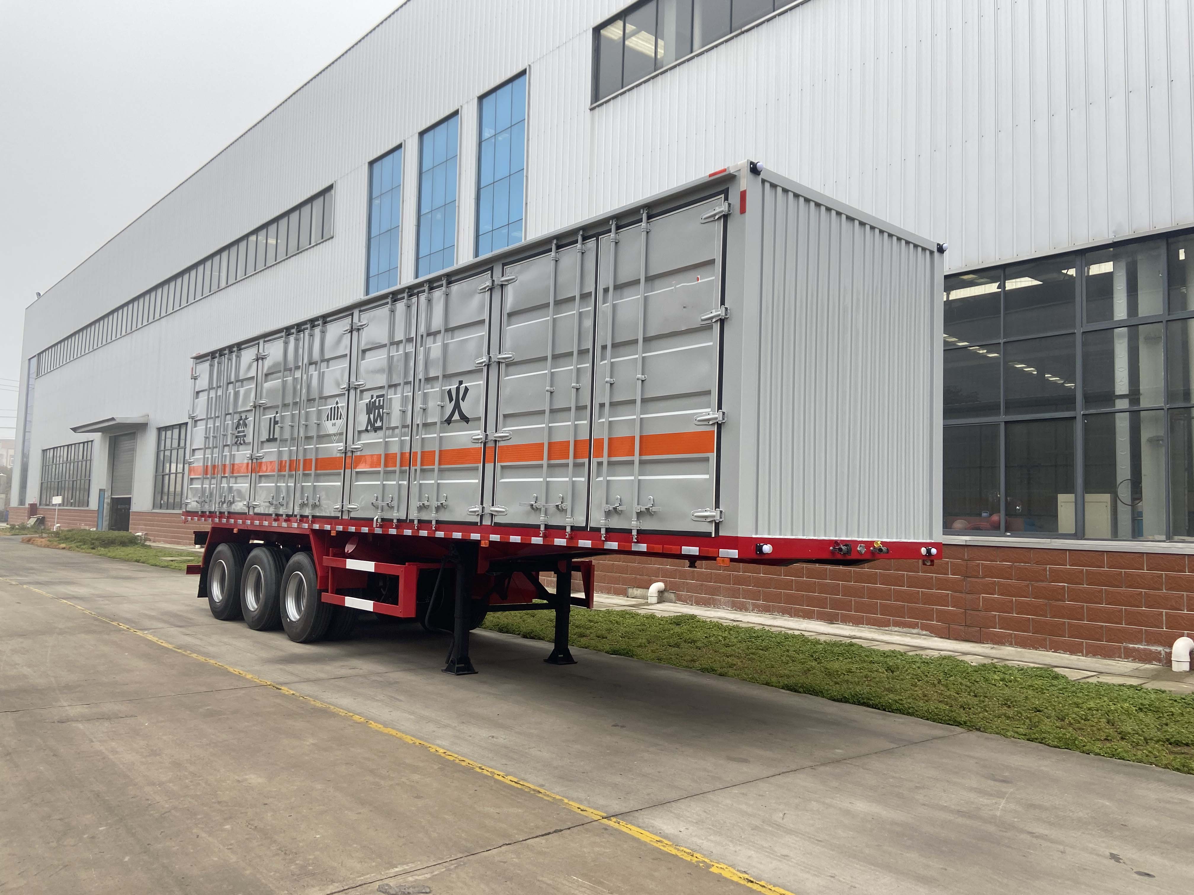 長途運輸裝載量,不能少的是一個車更方便更快捷地進行運輸。此時會用到的是左右開門更方便的半掛危險品車。該車采用的是氣囊減震橋。10噸富華盤式車軸,帶空氣懸掛,兩軸EBS,塑料樣式防飛濺擋泥板, 12條12R22.5真空胎帶普通鋼圈,50#牽引銷,28噸聯動支腿,一個工具箱,一個備胎架,箱體采用的是我司阻燃材料,為了方便裝貨,采用的是左右開門。側門全開的形式,裝貨更方便。貨箱采用的是免漆鋼板一次性沖壓成型的百葉窗,內飾為導電性能良好的合金板有透氣孔,內襯為矩形管骨架牢靠穩定,骨架內部填充為透氣防潮阻燃的擠塑板。廂體外部四周鋁合金型材包邊,底板和車廂前下部鋪橡膠皮,后門雙開,右側選裝側開門,內部安裝固定貨物的臥環或腰欄,安裝煙霧報警器、防盜感應器。車身附件靜電接地帶、滅火器、防火罩、危險品三角燈、橙色反光帶、CCC反射板。