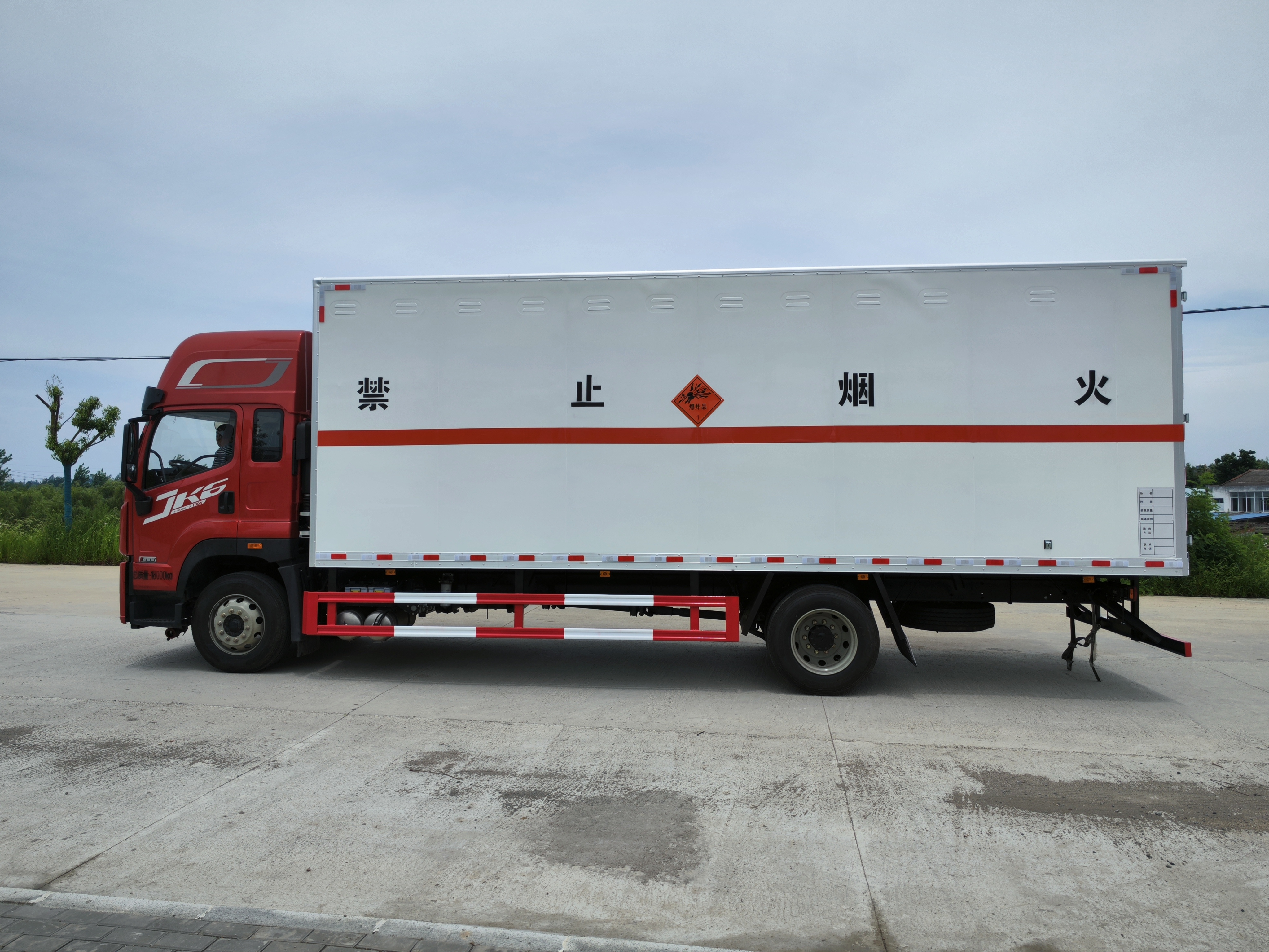 解放JK6國六7米8爆破器材運輸車采用的是專用危化品配送車,錫柴250馬力,高頂雙臥駕駛室,法士特8擋變速箱,匹配的是電動玻璃升降、電動后視鏡、側圍網兜、后圍窗簾導軌、全景窗簾導軌、頭頂放物盒、駕駛員座椅為空氣減振座椅、中間座椅、單DIN北斗兼容車載系統、電源總開關控制開關,ф395離合器,變速箱CA8TAX090F變速器,240PS,車橋ф378沖焊橋(進口ABS、1878輪距),275/80R22.5型18層級無內胎,新F4N-1900前軸,速比:4.875,其他:237×75×6.5,自動空調、前下防護裝置、VOSS管路及接頭、300L鋁油箱、電子手油門、一體式金屬寬體保險杠、電動液壓舉升、限速79km/h、排氣火花熄滅器、整車配備靜電拖地帶1根、駕駛室帶2kg干粉滅火器1個、排氣尾管及消聲器前置、前盤后楔式制動器、懸架3/-(4氣囊、電控ECAS)、安全帶佩戴提醒、制動器襯片更換報警、爆胎應急安全裝置、U型后處理、EBS(電控制動系統)、ESC(電子穩定性控制)、單胎帶TPMS(胎壓監測)、鋁貯氣筒、LDW(車道偏離報警)、FCW(前碰預警)、車身左側帶“精致版”字樣、U型后處理、T-box1.5、排氣節流閥、AEBS(自動緊急制動),后懸架升級加強。