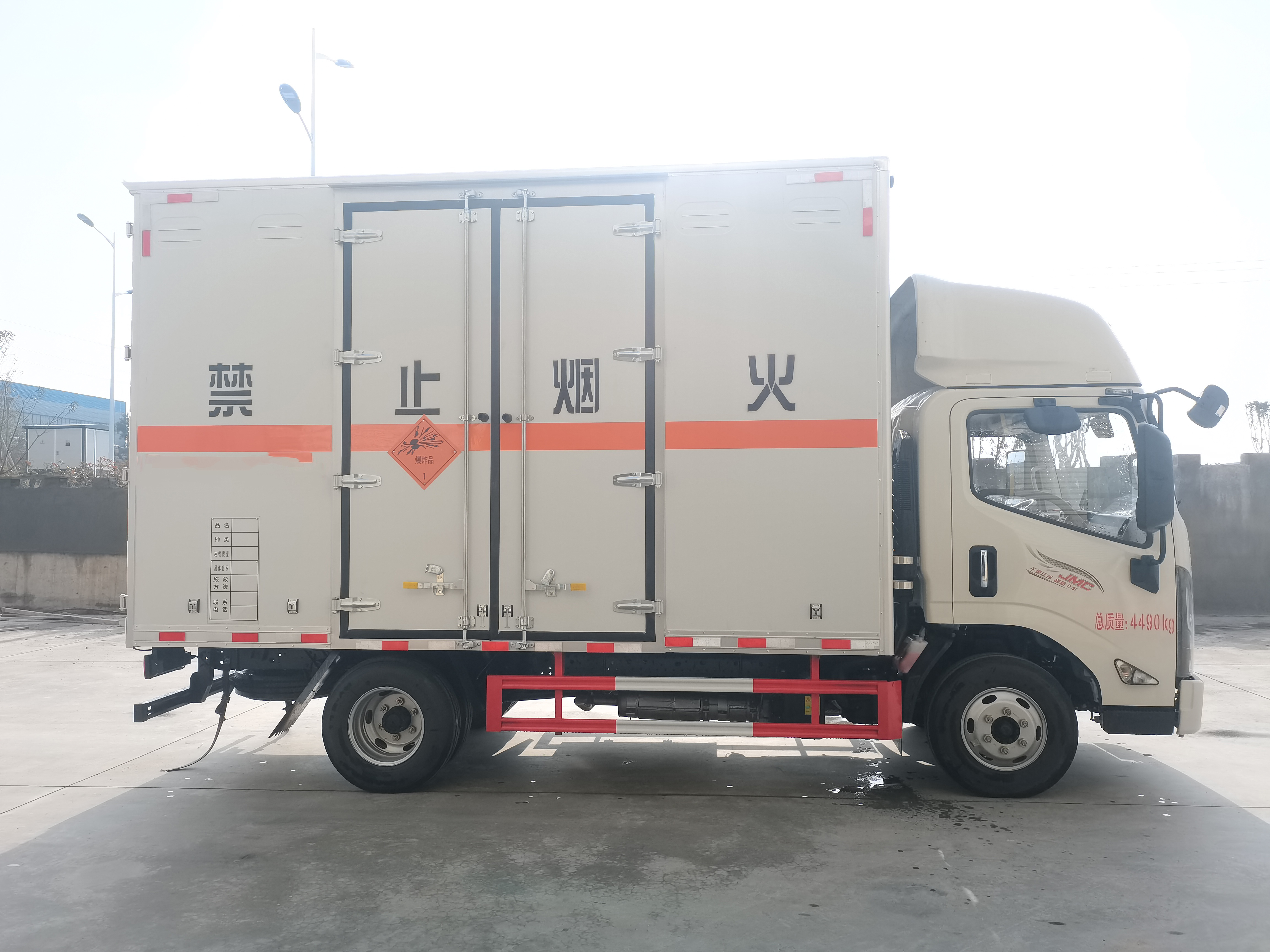 整備質(zhì)量(kg):3345,3300,3245,3145,廂體為雙層金屬結(jié)構(gòu),外板采用靜電屏蔽烤漆板,中間填充B1級(jí)阻燃泡沫,內(nèi)飾為鋁板。廂體上側(cè)安裝防雨通風(fēng)透氣孔。底板為花紋板,上鋪防靜電膠皮,廂體右側(cè)中開單側(cè)門。廂內(nèi)兩側(cè)加裝固定貨物臥環(huán),門框帶防盜報(bào)警器,頂部帶煙霧報(bào)警器。配備隨車工具,滅火器,三角頂燈,防靜電拖帶,貼反光標(biāo)識(shí)等。其他按公告標(biāo)準(zhǔn)制作。