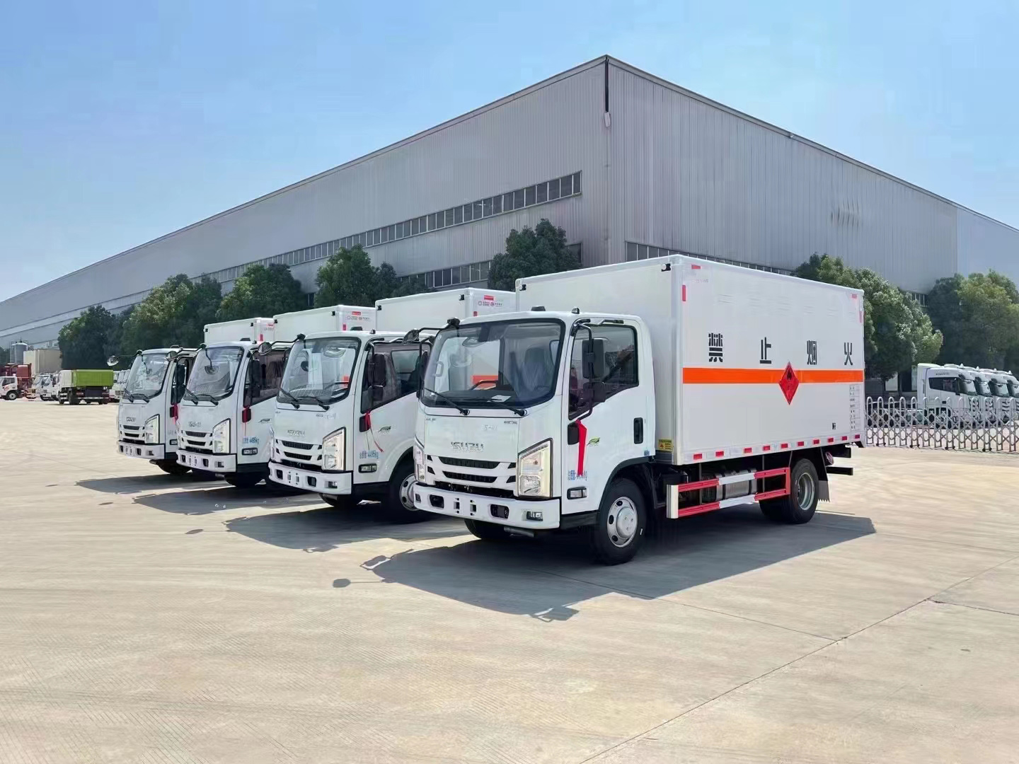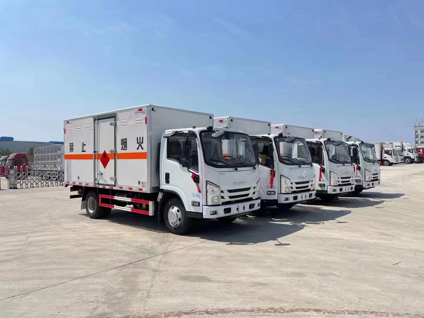 五十鈴黃牌國六爆破器材運輸車嚴格按照公告尺寸制作。外板采用烤漆板帶百葉窗,內(nèi)飾為導電性能良好的鋁平板有透氣孔,矩形骨架結(jié)構(gòu)內(nèi)部填充防火阻燃材料,復合加鉚合工藝。廂體四周鋁合金包邊及包角,車廂底板3mm鋪設防靜電膠皮,廂體前臉50公分高鋪設防靜電膠皮。后部設置對開門,右側(cè)單開門,廂體內(nèi)部兩側(cè)安裝捆綁貨物的臥環(huán)。廂體內(nèi)部安裝煙霧報警器及防盜報警感應器。車廂一周粘貼橙色反光帶,箱體粘貼 菱形標志牌,安全告示牌,危險品牌,箱體安裝示廓燈(前白后紅),拖地靜電帶。