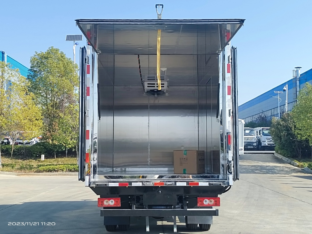 福田奧鈴國六醫療廢物轉運車選用的是福田奧鈴危險品專用底盤,國六排放標準,廂體尺寸:4060*2100*2100mm,可選云內150馬力發動機或康明斯131馬力發動機,帶5檔變速箱,7.00鋼絲胎,帶空調,方向助力,中控鎖,電動車窗,排氣管前置,ABS限速,車道偏離預警,前碰撞預警。根據醫療廢物轉運車要求,該車外板采用玻璃鋼,中間填充隔熱阻燃材料,廂內全部為不銹鋼內板,尾部帶不銹鋼門內門(選裝側門),帶-5度冷藏機組。上裝工具包括靜電帶,滅火器,防火帽,三角頂燈。國標反光標示及警告標志。匹配有不銹鋼五金件,紫外線殺毒燈,噴霧消毒壺和噴淋裝置。