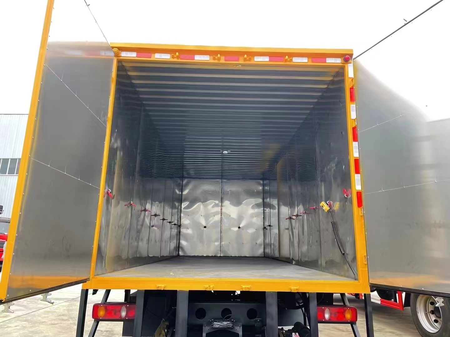 東風天錦外瓦楞板內不銹鋼板樣式危險品車選用的是貨廂尺寸6600*2400*2400,額載10噸,康明斯210馬力,帶2噸液壓尾板。廂體內部特殊定制,不銹鋼材質。整車型號:CSC5181XZWD6,箱體選用的是外冷軋板折彎而成瓦楞板,內部為了更好地耐用耐腐蝕性,選用的是整體不銹鋼板,在扎實耐用的情況滿足更好地使用。