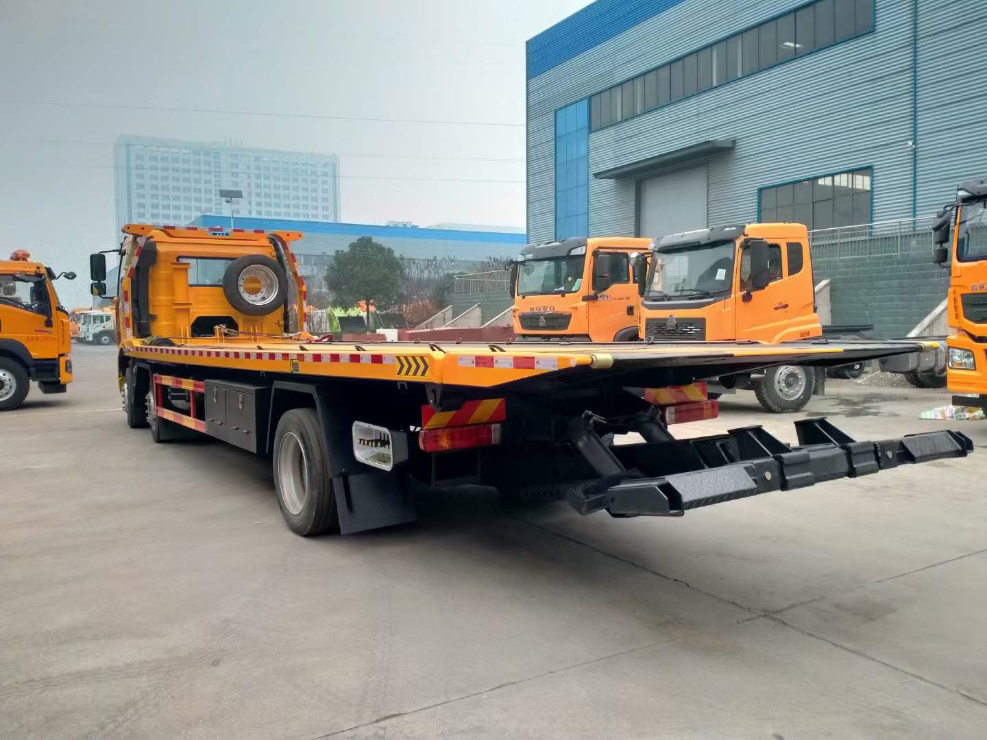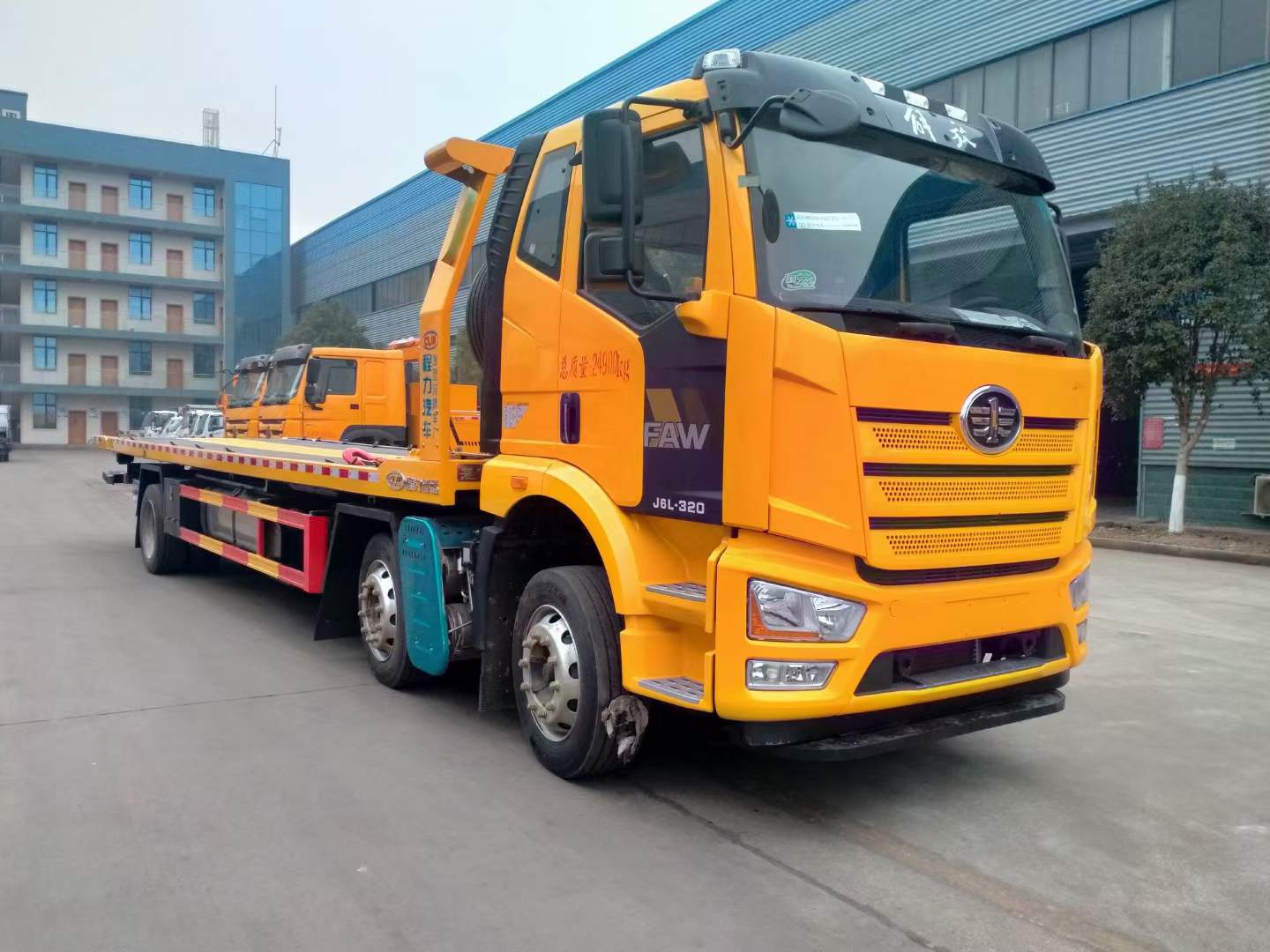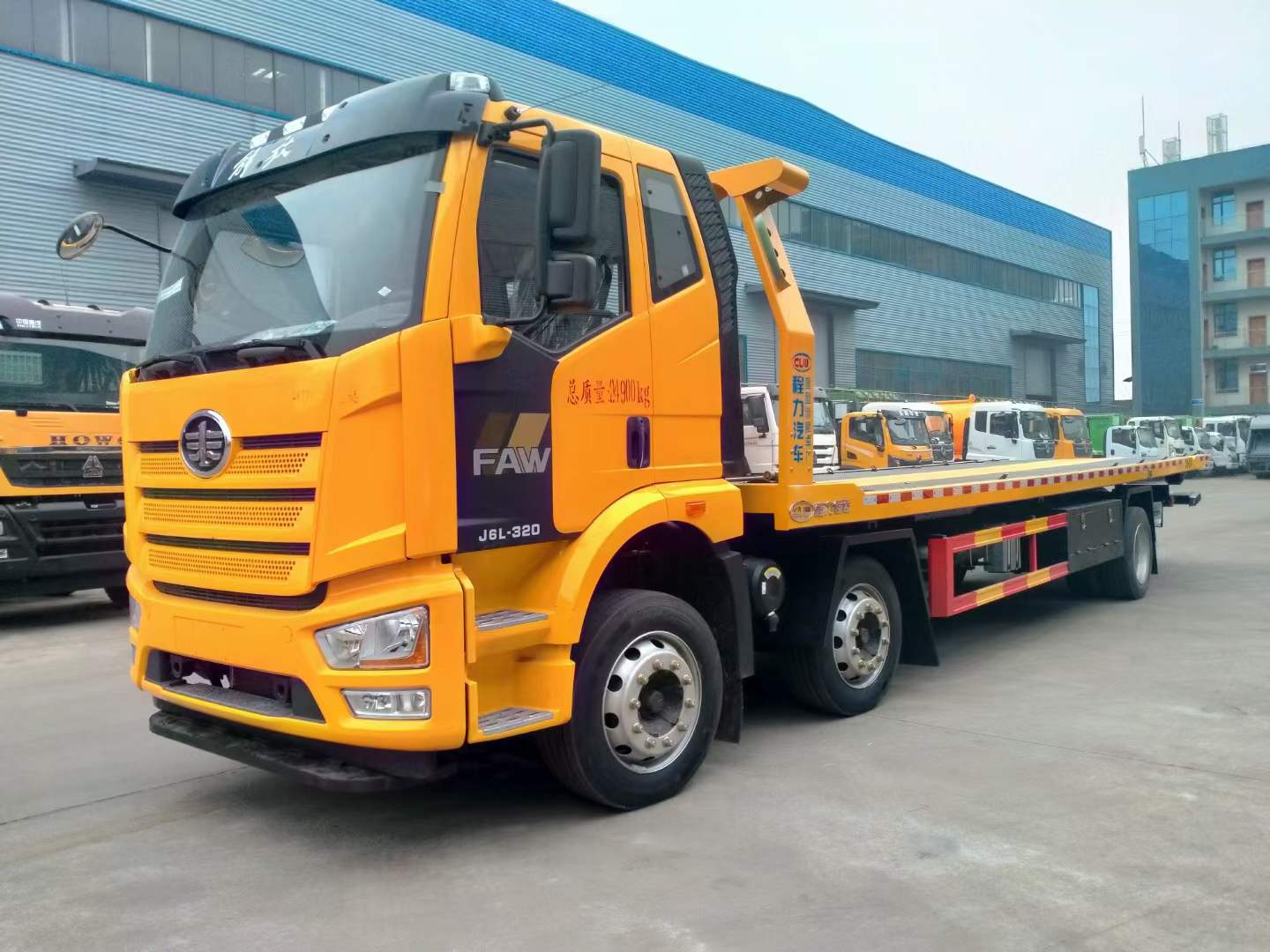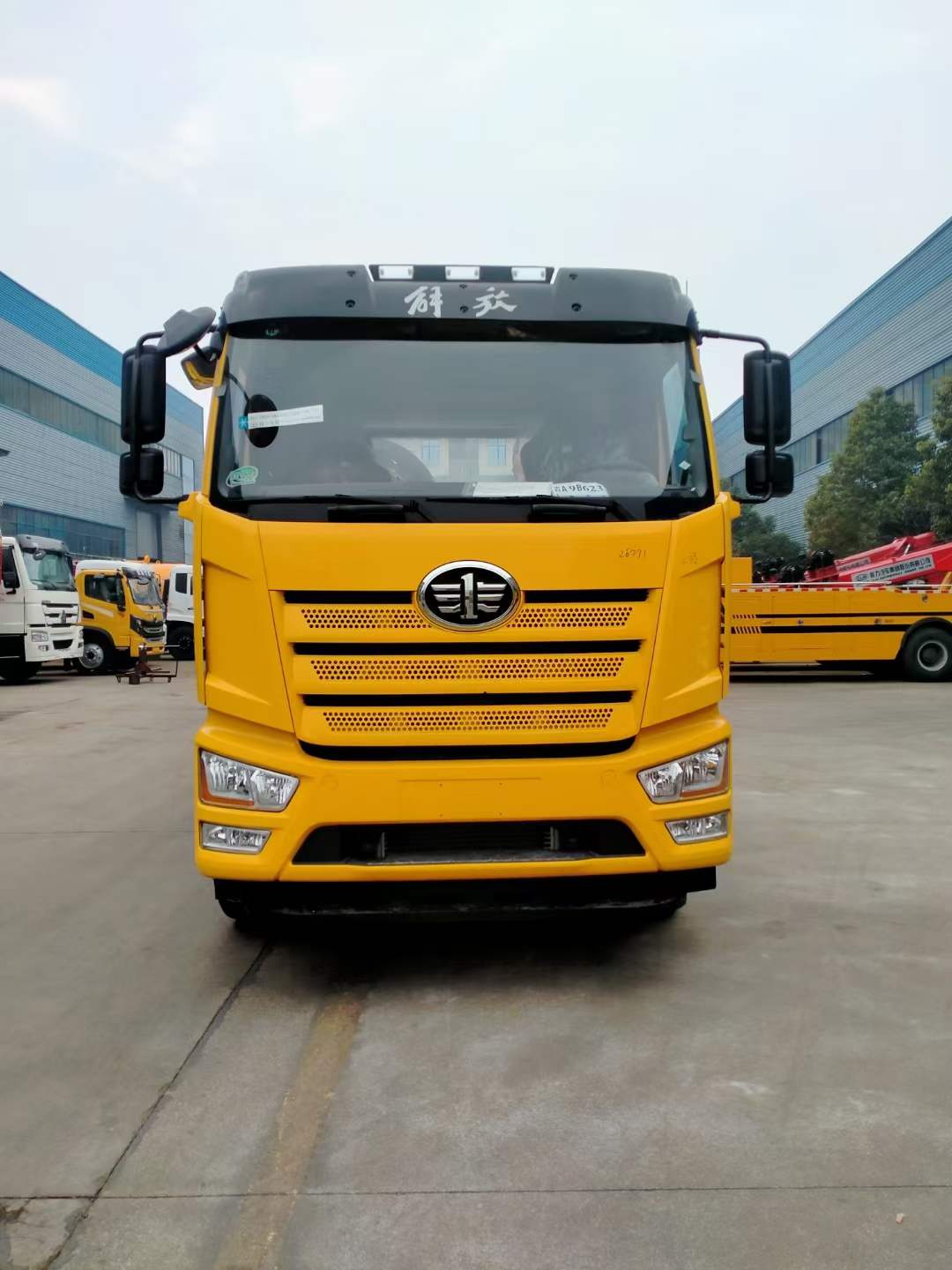 解放小三軸一拖二國六清障車選用的是新J6L全浮平頂排半駕駛室、電動玻璃升降,可選大柴280或者320馬力,變速箱CA8TAX100F變速器,車橋ф435沖焊橋(自動調整臂、國產ABS、1878輪距)軸距1900+5600mm,車架:270×75×(7+5)輪胎:295/60R22.5型18層級無內胎,自動空調、前下防護裝置、鋼油箱300L、一體式金屬寬體保險杠、駕駛室四點螺簧懸置、電動液壓舉升裝置、鋼儲氣筒、前鼓后楔式制動器、120Ah免維護蓄電池、LED轉向燈、霧燈帶輔助遠光、懸架10/10/12+9、水壺座、定速巡航、機箱橋體現6/6/6萬公里長換油周期、限速89km/h、T-box2.0、排氣節流閥、30L尿素罐