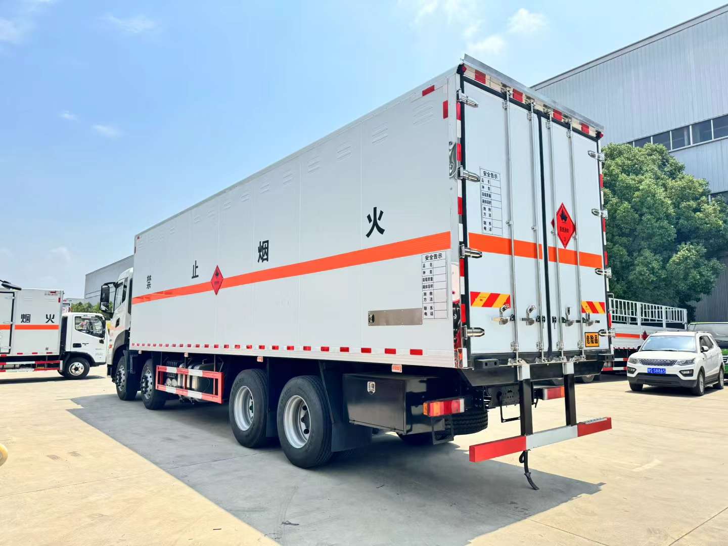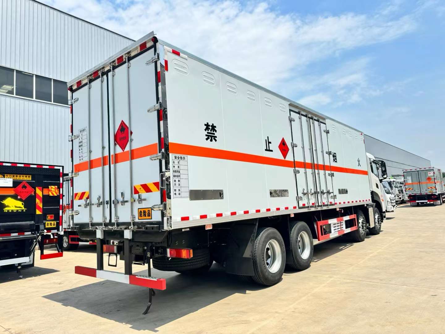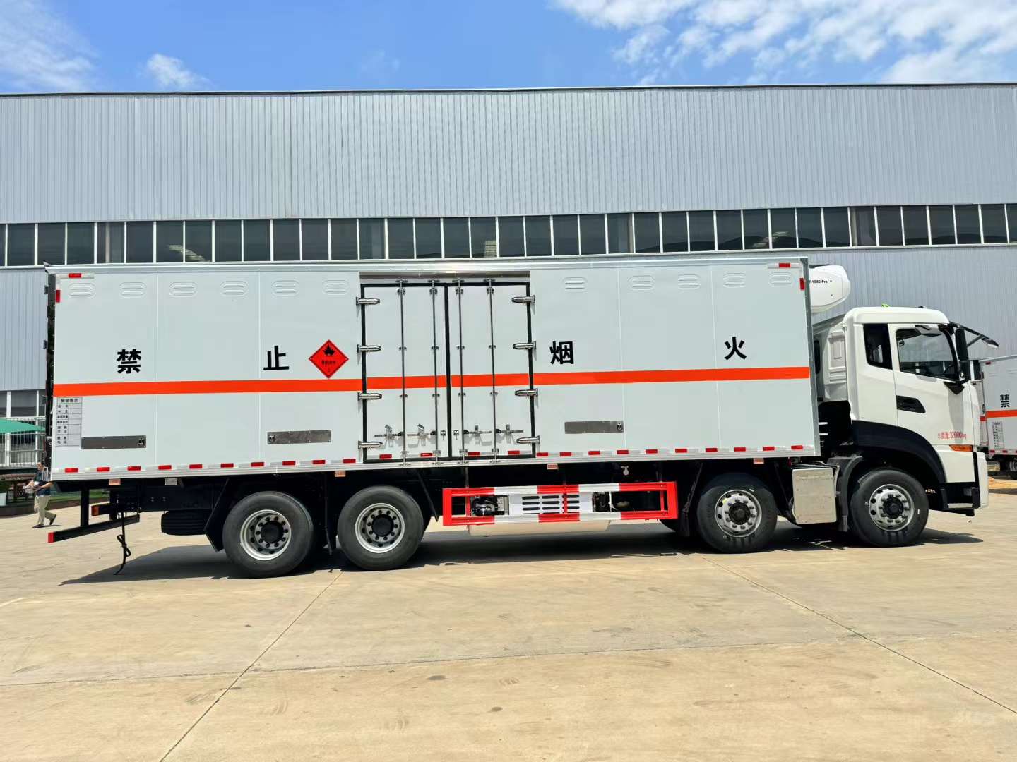 東風天龍國六前四后八帶冷機危險品車選用的是危化品專用底盤,可選350馬力發動機和400馬力,箱體選用的是帶保溫功能的危險品箱體,外觀美觀,防爆性能安全可靠,采用的是導靜電底板,箱體選用的是熱鍍鋅工藝骨架,從內到外部會生銹。所有脛骨劍全部是定制型的,堅固耐用。車輛全部用的是組合型無縫對接包角,防漏水性能好。