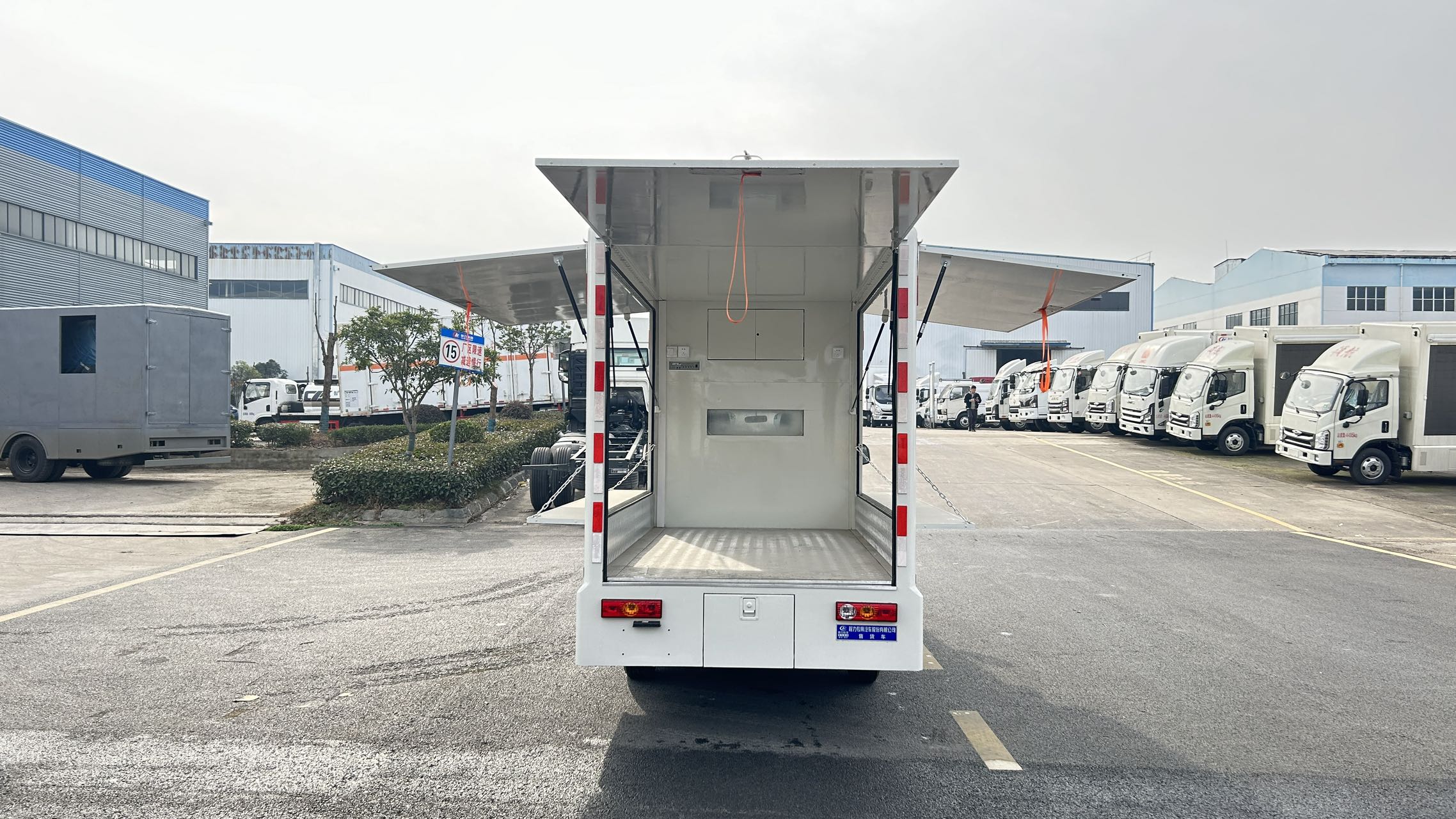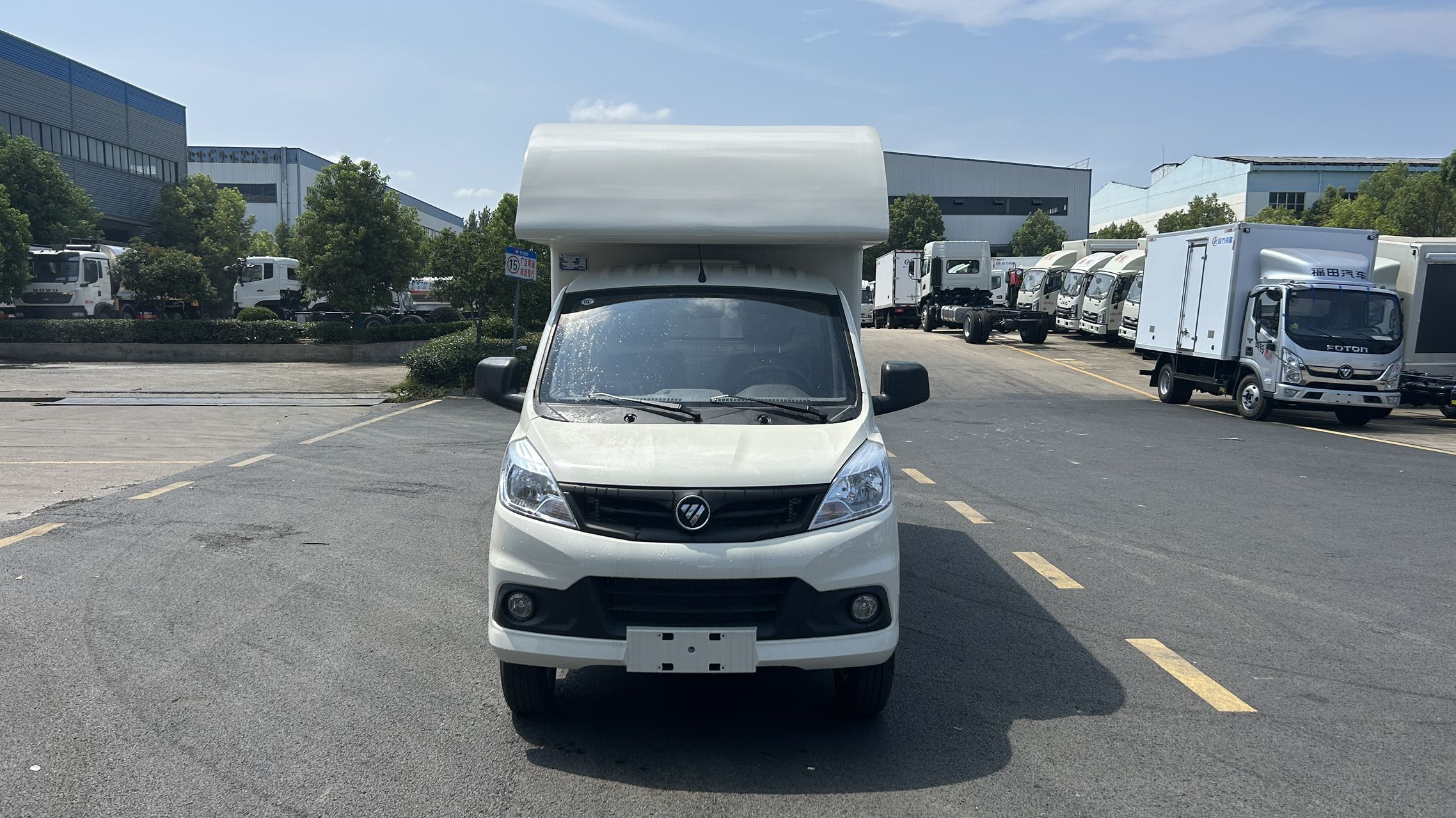福田祥菱V1售貨車箱體采用的是矩形方管骨架,冷板蒙皮結構,翻板采用內外彩鋼板,中間高性能保溫板,側板整體復合,輕量化,保溫隔熱。整體車身顏色為白色,可定制車身各種顏色彩條拉花,或各種噴涂樣式。