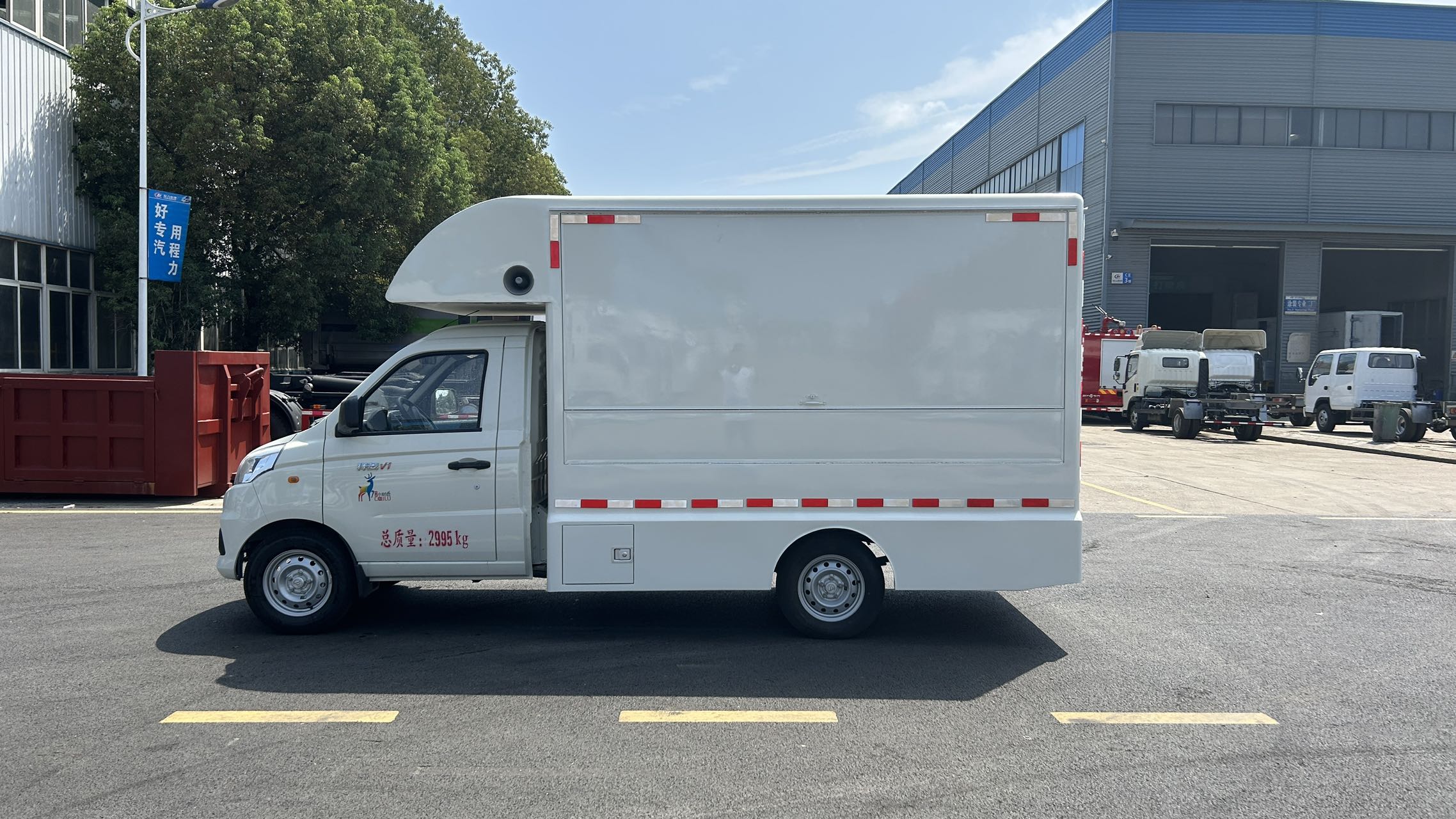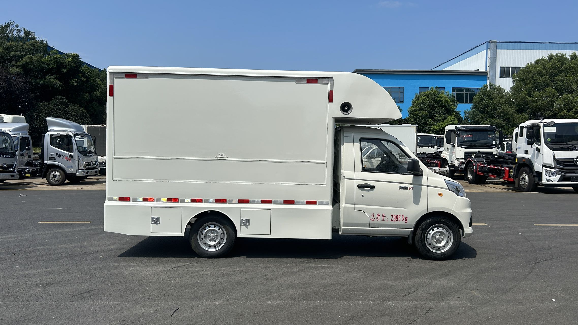 福田祥菱V1售貨車標配五孔插座2支。廂內照明LED燈條,外接220 V市電接口裝置。擴音喇叭2支,可插U盤播放音頻。可自行配備話筒進行喊話。可根據自身需求,定制貨柜,操作平臺,冷柜等設備。可選配供電裝置,汽油發電機或電池。