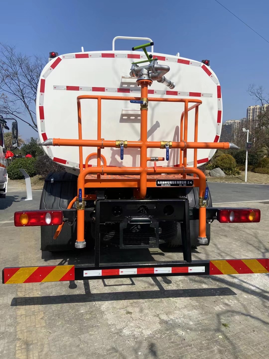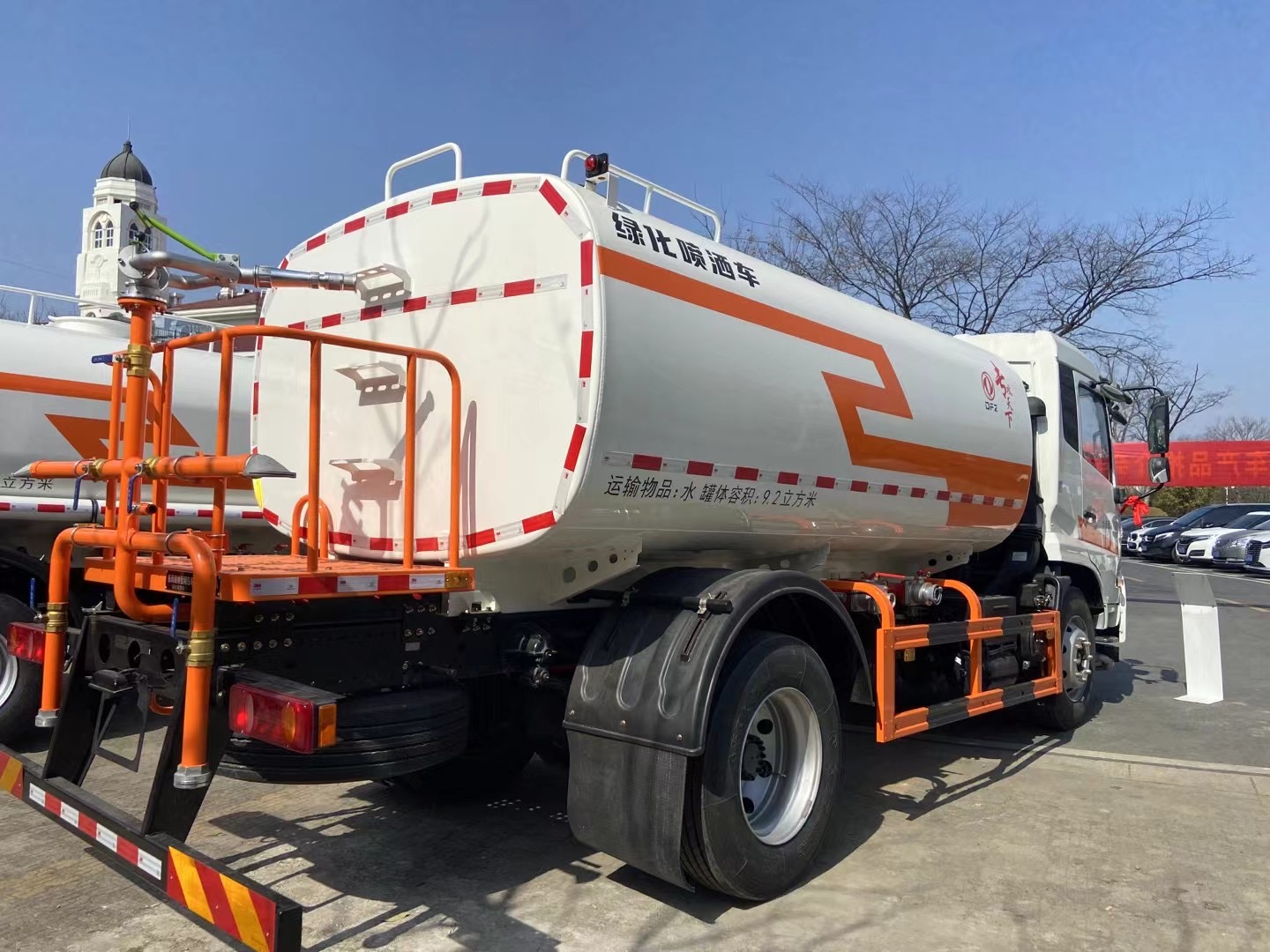 東風天錦國六12方灑水車側護網、后保險杠、均為螺栓連接,方便拆卸,維修方便。塑料擋泥板,替代鐵擋泥板,更加輕便,螺栓連接,方便拆卸。罐體尾部便捷式爬梯,取代扶手爬梯,更加美觀方便。