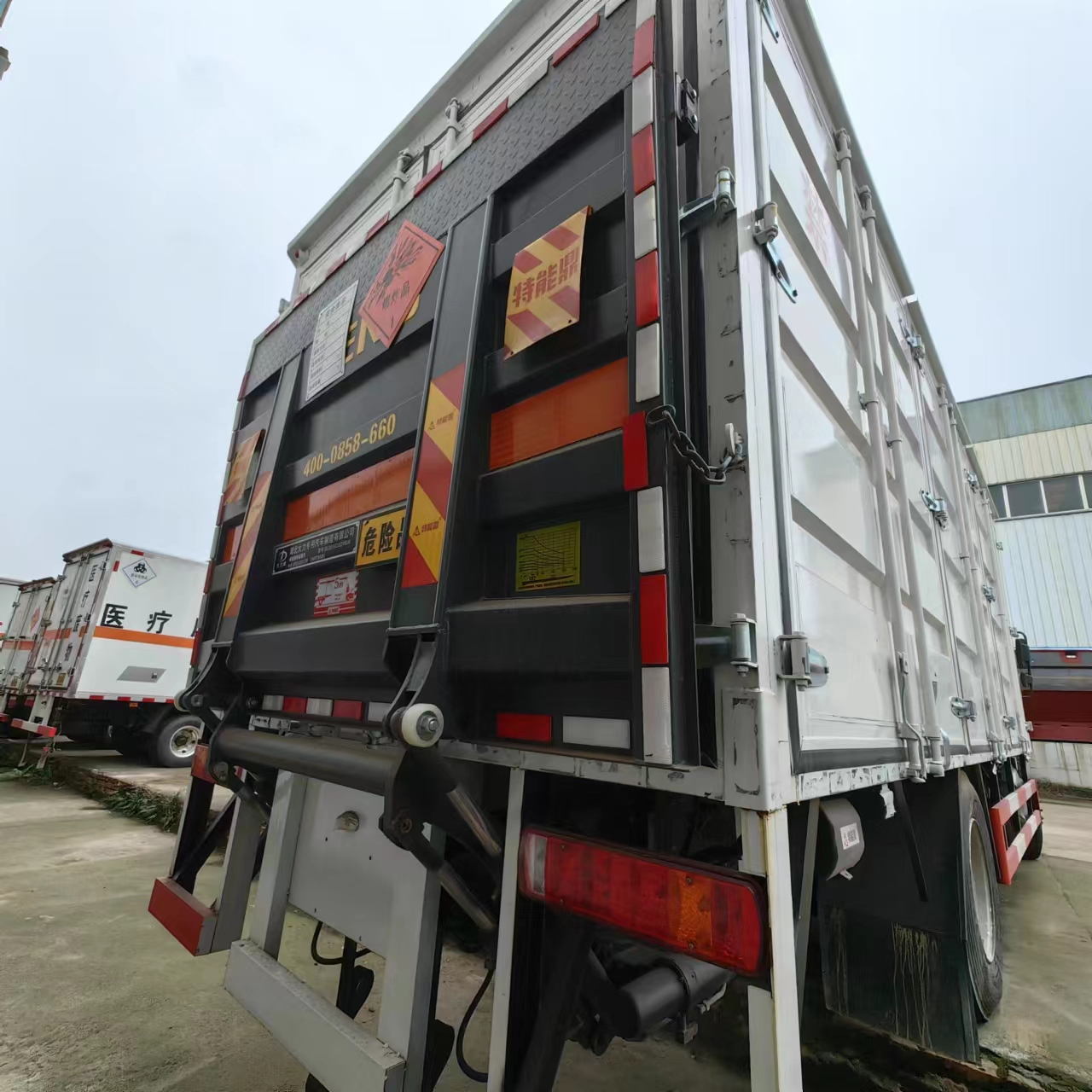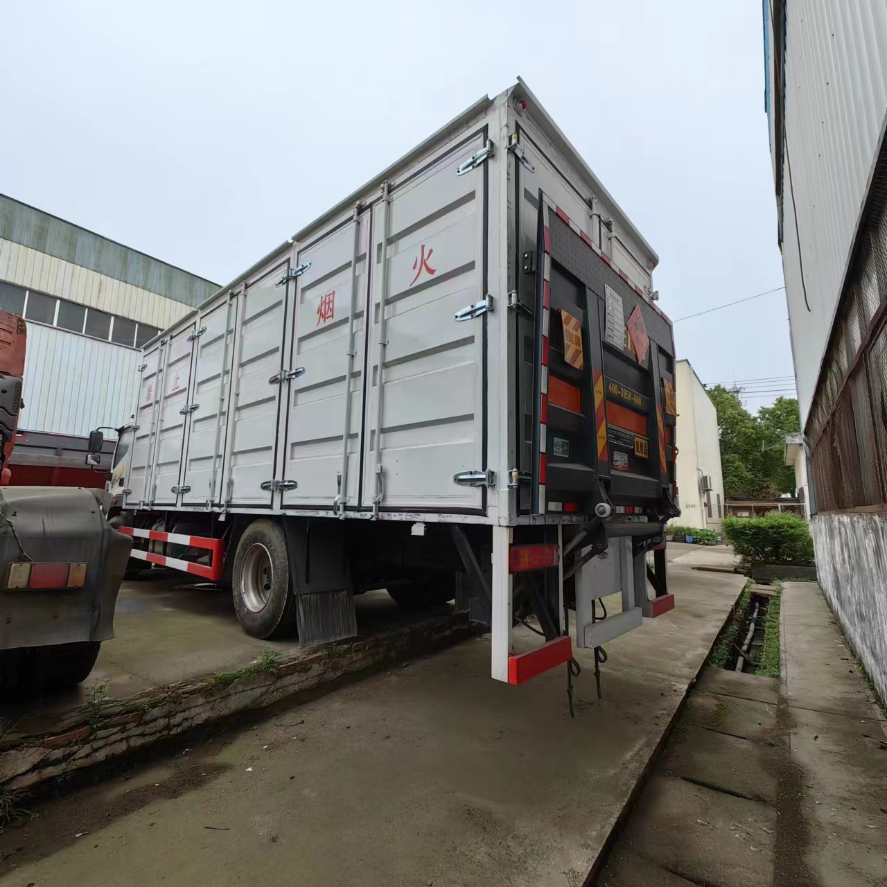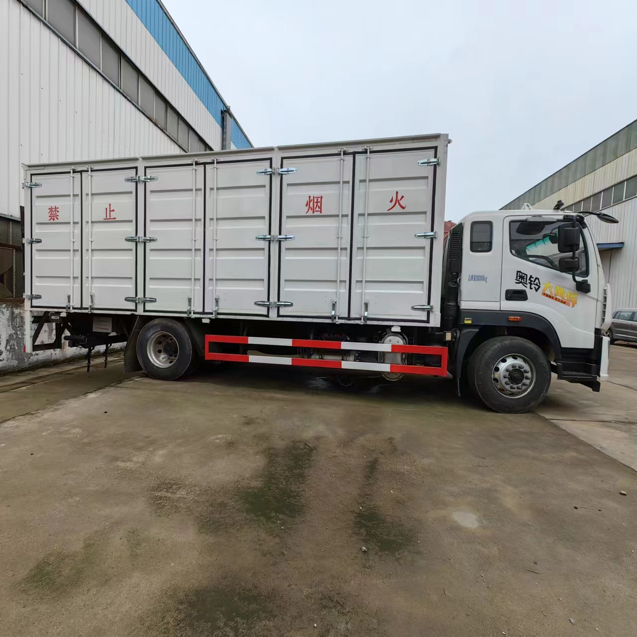 福田大黃蜂國六6米8危險品車采用廂式欄板車結構,外厚度為1.1毫米厚度武鋼冷軋鋼板(或沖壓成瓦楞板,以公告為準),內加強“幾”字型加強梁,車體底板加強處理并做防靜電處理。車體的左側、右側,和后欄板栓鉤結構,可向下打開,方便上下貨物,車體為空曠式車型,大大減少了運輸物品因為狹窄空和強烈碰撞產生氣瓶爆炸的危險性,箱體外觀涂裝白色油漆,在欄板的中間位置粘貼橙色的危化車標帶,并在車體的左、右、后部粘貼“易燃氣體”或“不燃氣體”標識。駕駛室內部配備兩只滅火器,后杠處安裝防追尾事故的緩沖固定塊。此款車輛屬于國家規定的危險品二類危險品運輸車。