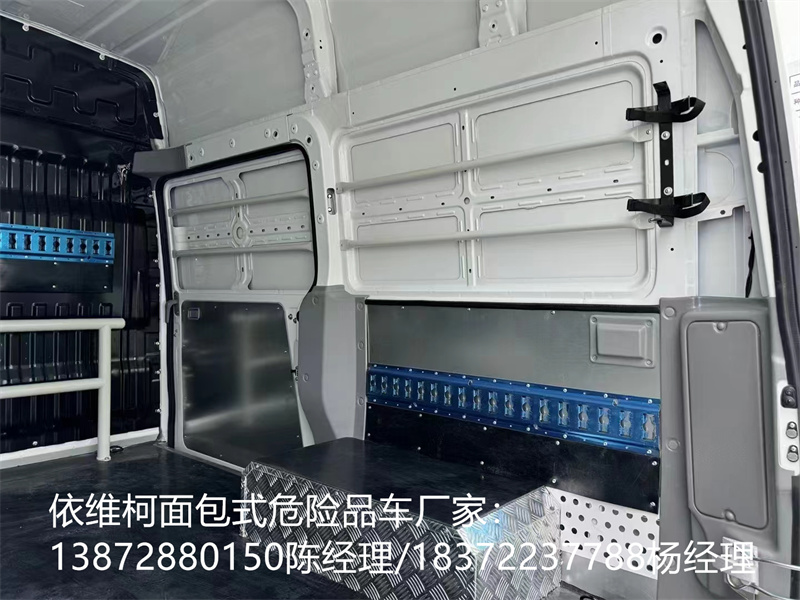 依維柯面包式易燃液體廂式車貨箱全盲窗,后門形式180度開啟雙開門,70L塑料油箱,ABS,排氣輔助制動系統,電磁式電源總開關,前霧燈,電動調節大燈,普通前大燈,前輪爆胎保險裝置,雙預警:車道偏離預警LDWS和前碰撞預警FCWS。車廂一周粘貼橙色放光帶,廂體底板上加裝綁扎環,箱體粘貼 菱形告示牌,安全告示牌,危險品牌,拖地靜電帶。