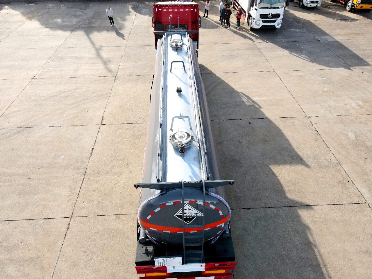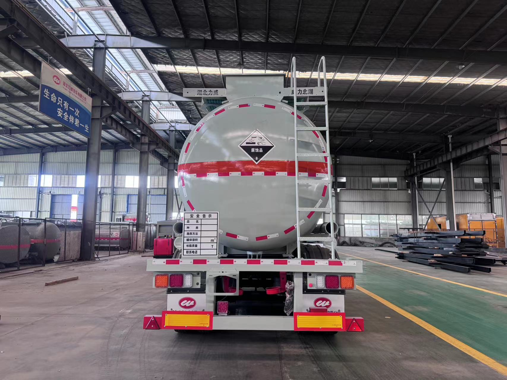 36方雜項罐式半掛車 整車型號為HLW9403GZW型雜項危險物品罐式運輸半掛車,罐體總容量:36立方,嚴格按照公告尺寸及公告圖片生產制作,罐體材料為Q235B型碳鋼板材,5.2mm厚,罐體通倉,兩個鋁合金歐標罐口蓋,罐口帶方盒子式上圍板,帶一套DN100鋁合金海底閥(海底閥帶聲光報警裝置),罐體尾部大梁下左右各一個DN80型鋁合金球閥出料帶碳鋼保護箱,帶護欄,走道,尾部爬梯,兩根卸料軟管,兩個滅火器,其余標配。骨架部分:3軸富華車橋(帶空氣懸架,盤式),12條成山牌12R22.5 12PR輪胎,一、三軸帶EBS,50#牽引銷,帶28T單動支腿,斷氣剎,制動襯片報警,一個備胎架,不含備胎,安全告示牌,靜電拖地帶,其余按廠家標配。