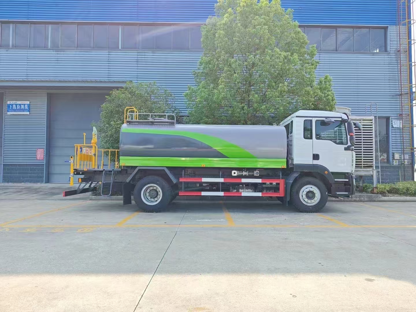 汕德卡12方灑水車選用的是環衛車專用底盤,底盤型號:ZZ5186XXYK501GF1,軸距:4500mm。選用的是汕德卡G5W基礎款駕駛室;匹配的是多功能方向盤、電動電加熱后視鏡、主氣囊+副簡易型座椅、 WP4.6NQ220E61發動機。定制的是HW95508STC變速箱+HW45ZC法蘭式取力器;1094自調臂前軸(鼓);MCJ09BG自調臂單后橋(鼓);速比5.29;雙層車架(7+4/250);前后超強版多片簧(11/9+8);國產方向機;標準版排氣系統;ABS(4S/4M);高位保險杠(全金屬);普通車輪;295/80R22.5輪胎(混合花紋/18PR);手電一體電動舉升;200L鋁合金油箱;中國重汽智能通B版匹配的是大功率水泵,具有自吸自排的功能,垂直吸程大于6米。帶前沖后灑、尾部帶工作平臺,可選裝蛇形霧炮,帶可調節功能。