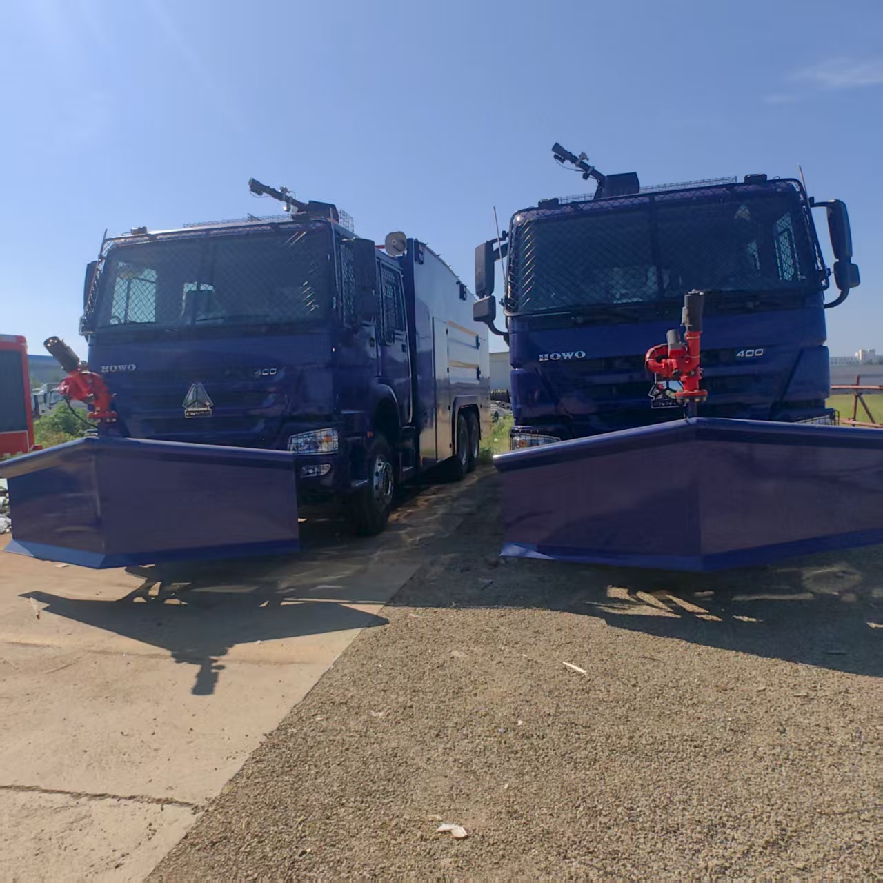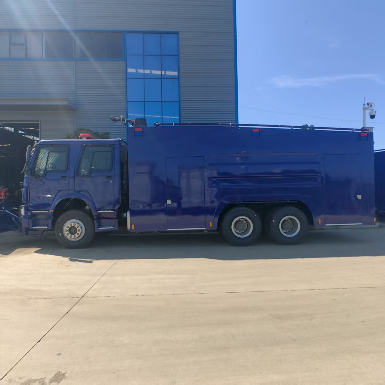 重汽豪沃避障維和治安車選用的是后雙橋底盤或者單橋底盤,可選多款發動機,該車用于維和治安,所以車輛所有涉及窗戶的地方全部采用的是防護網設計,車輛前部帶避障鏟,帶防爆消防水泵,可以進行水霧水噴灑,頂部帶高炮可灑泡沫或者辣椒水。采用的是遠程電動控制,所有管道全部采用的是不銹鋼控制。罐體容積可定制,根據高炮的設計定制有專用的管道。