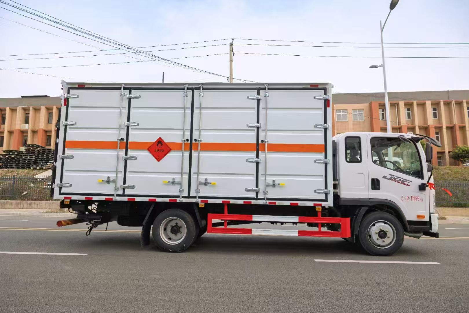 解放J6F帶全開門易燃液體廂式車采用的是危險品專用底盤,J6F(2010)單排駕駛室,大柴CA4DD2-18E6,陜齒8JS75C,325GH后橋(6噸后橋,16L尿素箱,帶國產ABS,液晶儀表,電加熱后視鏡,150L鋁合金油箱,板簧7/10+4,高架箱,空調+電動門窗+中控鎖,前后橫向穩定桿,后處理器前置+排氣火花熄滅器+前盤后鼓制動器+限速79KM/H+前碰撞預警+車道偏離輔助預警,北斗+GPRS行車記錄儀,帶靜電拖地帶,爆胎應急安全裝置,危化專用底盤。整車尺寸 7100×2550×3270(mm),廂體尺寸 5200X2400x2100。額載噸位7噸,裝貨多不容易超載。采用瓦楞板箱體,底板為4mm花紋板上鋪防靜電膠皮,廂體右側全部開門。底部橫梁加密25左右,門框帶防盜報警器,頂部帶煙霧報警器。其他按標配制作,配備隨車工具。