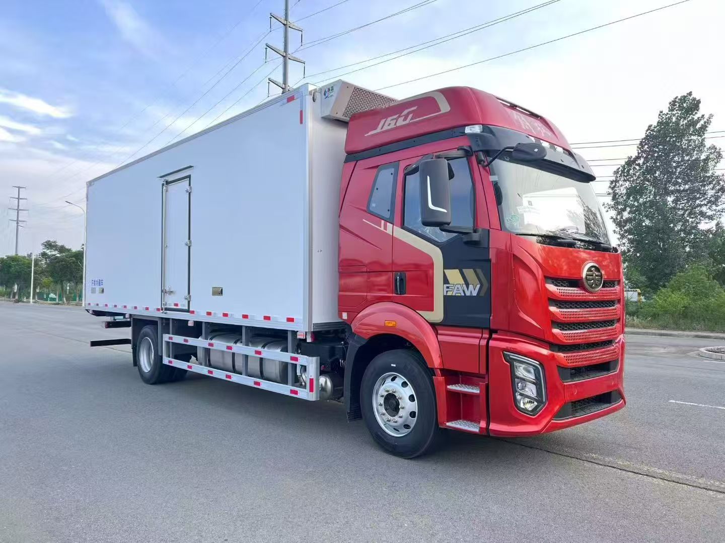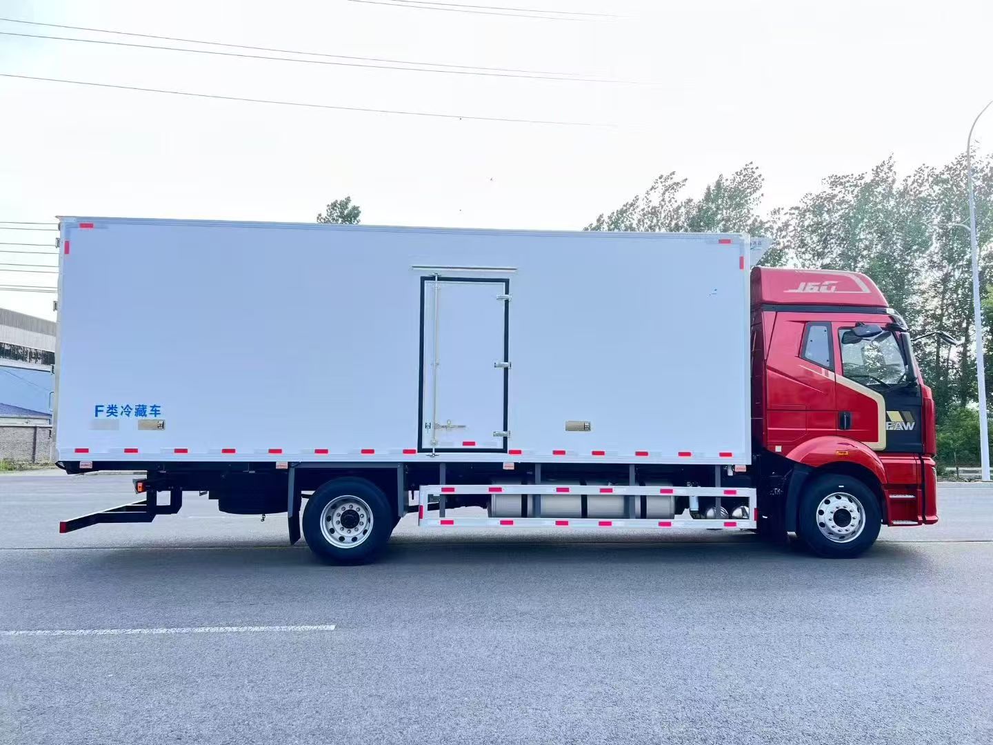 解放J6G國六大柴360馬力單橋6米8冷藏車整車型號:CA5181XLCP62K1L4E6,整車尺寸:9180x2600x4000mm,箱體尺寸:6800x2420x2500mm。選用的是大柴360馬力發動機,CA6DK2A36E65(SCR only),變速箱CA10TAX130S變速器(全鋁殼體、同步器),2025款J6G領航版全浮高頂排半平地板駕駛室,彩色儀表,電動玻璃,電動電加熱一體式后視鏡,側圍網兜,駕駛員真皮通風座椅(氣動腰托、變阻尼、雙扶手、集成式安全帶),副駕座墊翻折,帶1個24V電源接口,儀表臺USB接口,豪華版十寸大屏集成四方位影像,多功能大角度方向盤,760mm整體式臥鋪,智能語音控制,中控鎖,手機支架,高品質揚聲器,腳窩燈,車門下裝飾板,自動空調,600L鋁油箱,50L尿素罐,駕駛室四點空氣懸置,電動液壓舉升,鋁合金儲氣筒,150Ah蓄電池,電控風扇,電動燃油粗濾器,LED自動透鏡大燈,LED日行燈,懸架7/7+3,定速巡航,機箱橋體現10/10/10萬公里長換油周期,限速89km/h,怠速暖機,80A發電機,帶側圍側頂拉花,車身左側帶“領航版”字樣,237x75x6.5車架,后橋速比:3.727,輪胎:275/80R22.5型18層級無內胎(國內一線品牌、低滾阻),軸距5300mm。