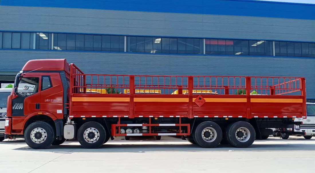 解放J6M前四后八氣瓶運輸車,它是根據國家有關部委對易燃氣體鋼瓶運輸的規范和用戶的要求而研制生產,產品符合國防科工委關于《氣瓶運輸車安全技術條件》的要求.具有廂體強度高、防火阻燃、防止靜電火花等主要功能.專業運輸各類氣體介質瓶裝轉運,如:液化石油氣瓶運輸車、鋼瓶配送車、煤氣瓶轉運車、氧氣瓶、二氧化碳氣瓶等。