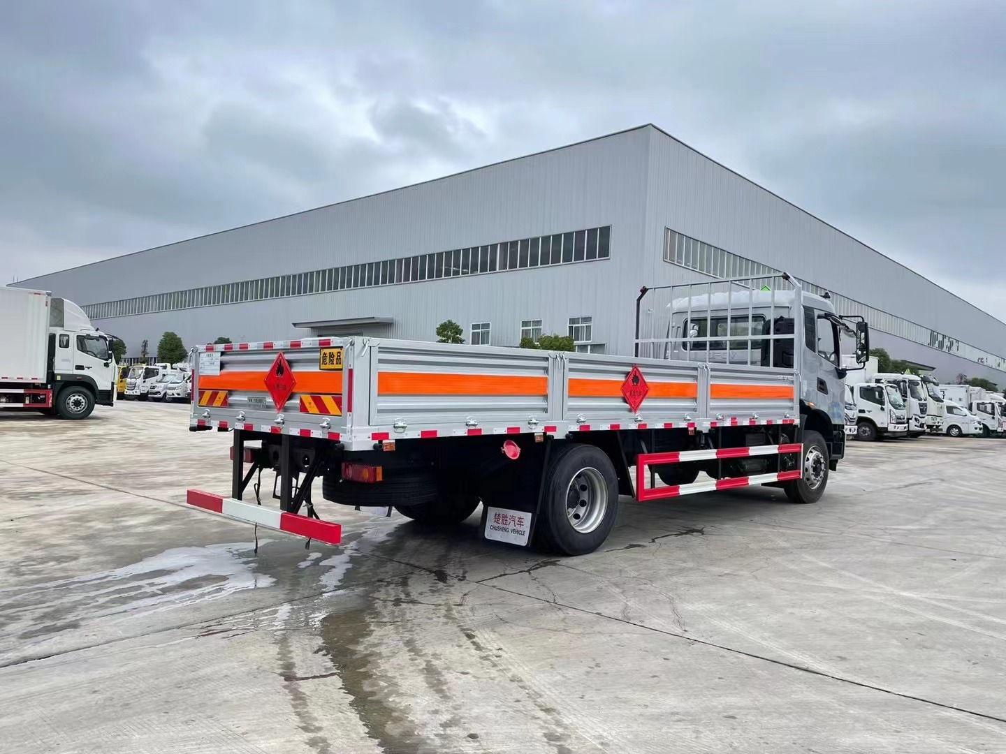 廂體邊板采用1.2mm冷板,底板標(biāo)配4mm花紋鋼板,欄板為4段,欄板高度為600mm,2個(gè)中立柱,花欄及花欄立柱可拆卸,底部立柱固定,底板上方鋪靜電膠皮,橫梁和副梁為槽鋼。底板及均做防銹處理,車廂一周粘貼橙色反光帶,箱體粘貼菱形標(biāo)志牌,安全告示牌,危險(xiǎn)品牌,拖地靜電帶。