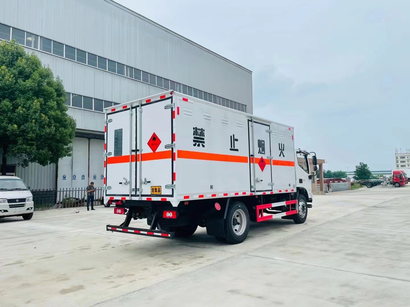 1,復(fù)合板工藝:嚴(yán)格按照公告尺寸制作。外板采用優(yōu)質(zhì)烤漆板(顏色可選:白,灰,檸檬黃)帶百葉窗,內(nèi)飾為導(dǎo)電性能良好的鋁平板有透氣孔,矩形骨架結(jié)構(gòu)內(nèi)部填充防火阻燃材料,復(fù)合加鉚合工藝。廂體四周鋁合金包邊及包角,車廂底板鋪設(shè)防靜電膠皮,廂體前臉50公分高鋪設(shè)防靜電膠皮。后部設(shè)置對開門,右側(cè)單開門,廂體內(nèi)部兩側(cè)安裝捆綁貨物的臥環(huán)。廂體內(nèi)部安裝煙霧報**器,門上安裝防盜報**器。車廂一周粘貼橙色反光帶,箱體粘貼菱形標(biāo)志牌,安全告示牌,危險品牌,箱體安裝示廓燈(前白后紅),拖地靜電帶。