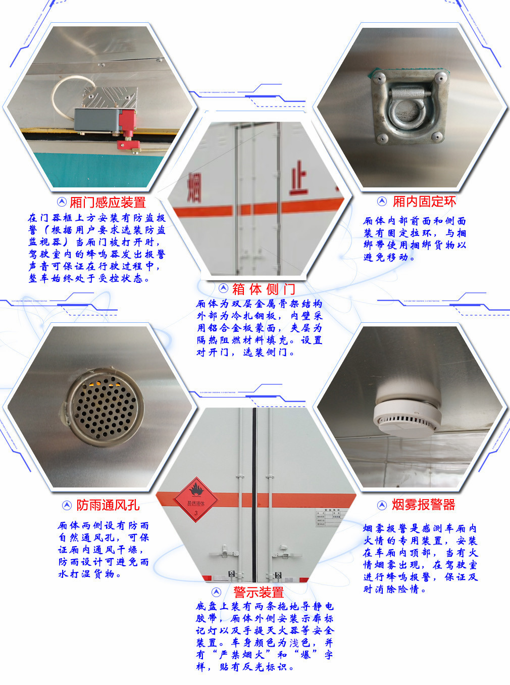 廂體配置:嚴(yán)格按照公告尺寸制作,外板采用1mm厚冷軋板有一次性成型的百葉窗,內(nèi)飾為導(dǎo)電性能良好的鋁板有透氣孔,內(nèi)襯為矩形管骨架牢靠穩(wěn)定,內(nèi)部填充為透氣防潮阻燃的擠塑板,四種材料經(jīng)現(xiàn)代工藝復(fù)合而成,廂體外部上下鋁合金型材包邊,底板和車廂前下部鋪橡膠皮,后門雙開,右側(cè)中部單開門,內(nèi)部有固定貨物的臥環(huán),車輛外部有靜電帶、滅火器、防火罩,車廂內(nèi)安裝煙霧報警器和門防盜報警器,嚴(yán)格按照國家危險品相關(guān)法規(guī)張貼。