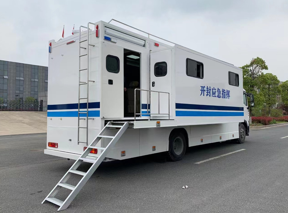 采用重汽豪沃4×2底盤(pán),車(chē)輛長(zhǎng)度10630mm;車(chē)內(nèi)配備9人會(huì)議桌椅,另配6個(gè)壁掛式折疊桌椅,廂體前面發(fā)電機(jī)倉(cāng)與會(huì)議室隔開(kāi),廂體尾部為控制室。廂體按空間區(qū)域分為前壁艙,乘、住區(qū),衛(wèi)生間。廂體采用聚氨酯發(fā)泡技術(shù)制作的保溫廂體,外蒙皮為1.5mm厚防銹鋁板、內(nèi)蒙皮為1.5mm防銹鋁板。對(duì)于有懸掛裝置要求的廂板,在相應(yīng)位置增加預(yù)埋和支撐。內(nèi)粘波音軟片,整個(gè)底部墊有麻灰色塑膠地板,結(jié)實(shí) 前壁艙內(nèi)放置地板蓋板,滅火器等配件;乘、住區(qū)在中部擴(kuò)展位,中間固定床設(shè)置在主廂體上,折疊床在左、右?guī)w上;左、右?guī)w前部各掛19寸車(chē)載液晶電視一臺(tái) 衛(wèi)生間在后部,頂部安裝天窗、換氣裝置;主廂體頂部設(shè)有空調(diào),沿頂部送風(fēng)管道向廂體各處送風(fēng)。各風(fēng)口安裝雙眼布風(fēng)器,可調(diào)節(jié)風(fēng)量及角度;主廂體頂部設(shè)置衛(wèi)星接收天線;整車(chē)設(shè)置3個(gè)單開(kāi)門(mén),800× 1800鋁合金后門(mén)1套、小廂575*1750房車(chē)門(mén)2套,左、右?guī)w兩側(cè)安裝鋁合金推拉窗共6(1000*600)扇,內(nèi)側(cè)安裝窗簾。廂體后部設(shè)置可折疊蹬頂梯通向車(chē)頂,廂體頂部粘接防滑粘。