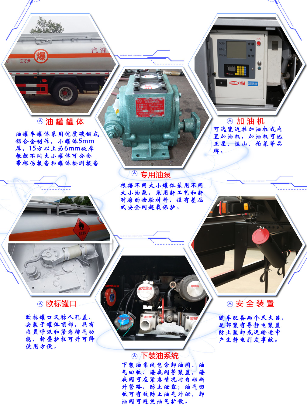 上裝配置:罐體采用5mm厚碳鋼制作而成壓封頭,折疊護欄,泵進泵出,海底閥,油氣回收,下裝油口,歐標罐口。