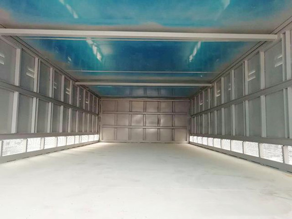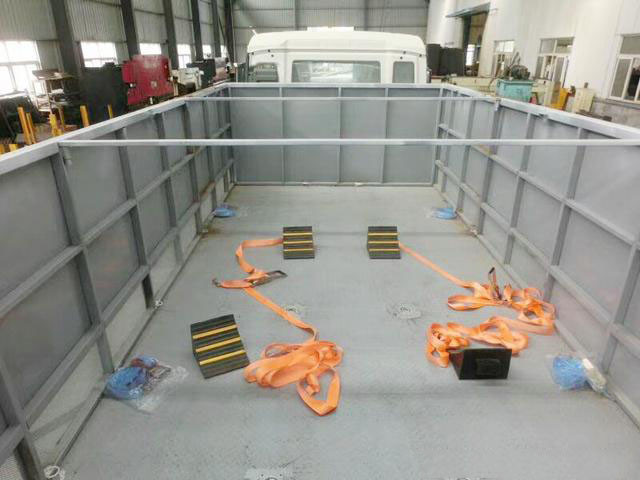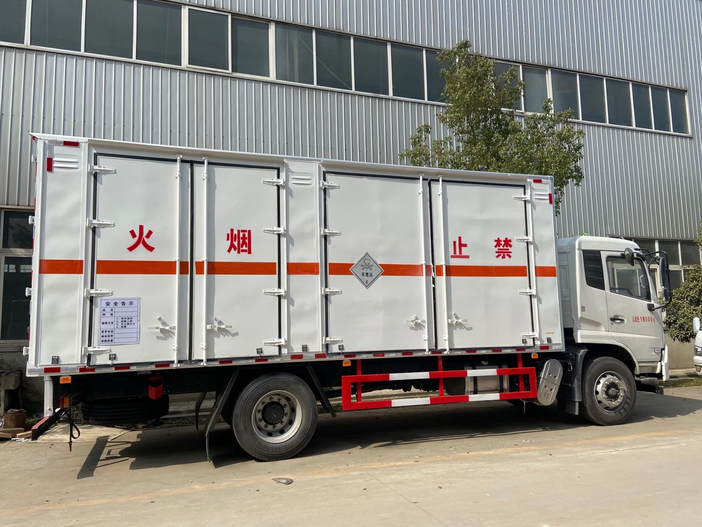 廂體配置:嚴格按照公告尺寸制作。外板采用優質冷軋鋼板帶百葉窗,內飾為導電性能良好的鋁平板有透氣孔,矩形骨架結構內部填充防潮阻燃擠朔板,復合加鉚合工藝。廂體四周鋁合金包邊及包角,車廂底板鋪設防靜電膠皮,廂體前臉鋪設防靜電膠皮。后部設置對開門,可選裝側門位置,廂體內部兩側安裝捆綁貨物的臥環。廂體內部安裝氣體感應器及防盜報警器。車廂一周粘貼橙色放光帶,箱體粘貼 菱形告示牌,安全告示牌(鋁合金材質),危險品牌,箱體安裝示廓燈(前白后紅)。該車適用于運輸危險品,廂體頂部封閉,不可開啟。危險貨物運輸車輛類型為:AT型;用于運輸具有獨立容器(瓶)包裝的毒性氣體:液氯,類項號:6.1;液氨,四氟化硅,類項號:2.3。