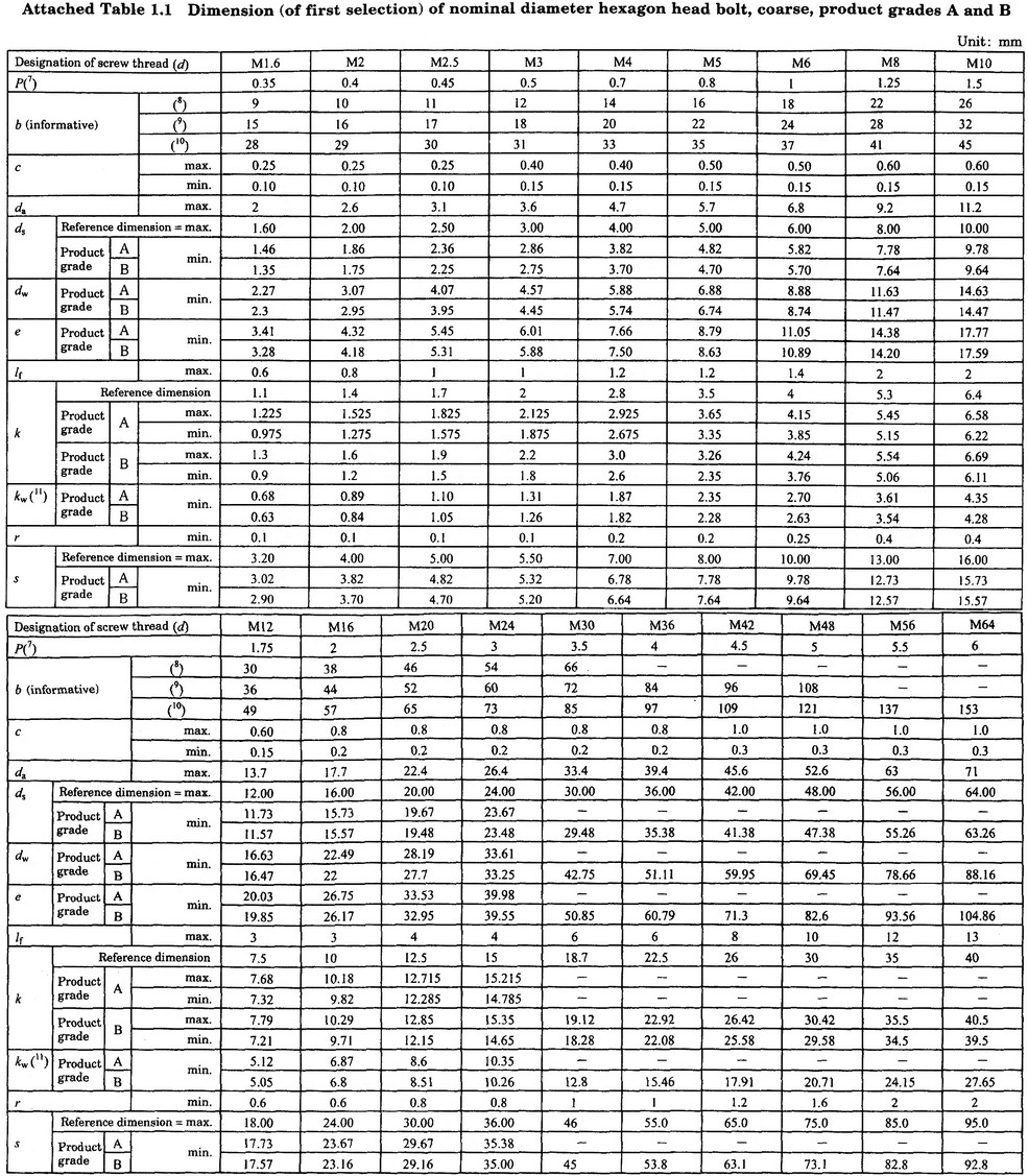 JIS B 1180: 2004 | ISO 4014: 1999, 4015: 1979, 4016,4017,4018:1999,8676: 1999, 8765: 1999