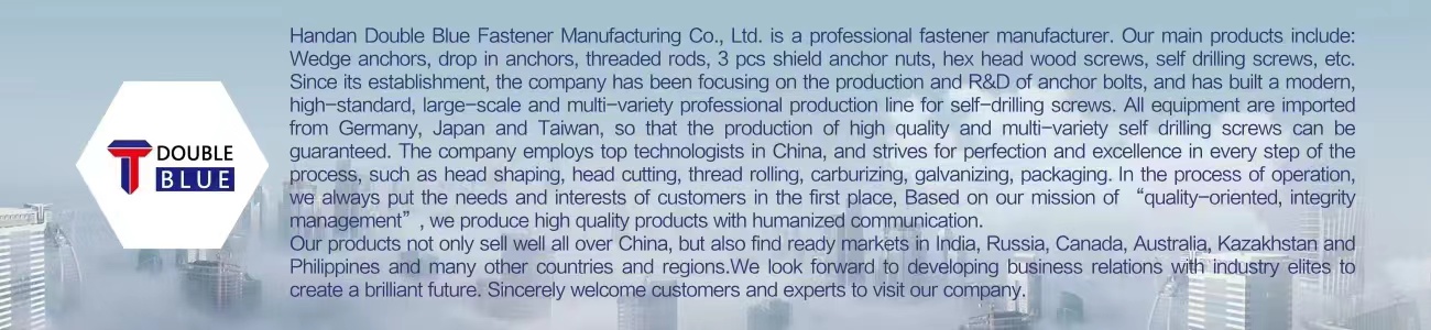 Handan Double Blue Fastener Manufacturing Co., Ltd. is a professional fastener manufacturer. Our main products include: Wedge anchors, drop in anchors, threaded rods, 3 pcs shield anchor nuts, hex head wood screws, self drilling screws, etc. Since its establishment, the company has been focusing on the production and R&D of anchor bolts, and has built a modern, high-standard, large-scale and multi-variety professional production line for self-drilling screws. All equipment are imported from Germany, Japan and Taiwan, so that the production of high quality and multi-variety self drilling screws can be guaranteed. The company employs top technologists in China, and strives for perfection and excellence in every step of the process, such as head shaping, head cutting, thread rolling, carburizing, galvanizing, packaging. In the process of operation, we always put the needs and interests of customers in the first place, Based on our mission of “quality-oriented, integrity management”, we produce high quality products with humanized communication. Our products not only sell well all over China, but also find ready markets in India, Russia, Canada, Australia, Kazakhstan and Philippines and many other countries and regions. We look forward to developing business relations with industry elites to create a brilliant future. Sincerely welcome customers and experts to visit our company.